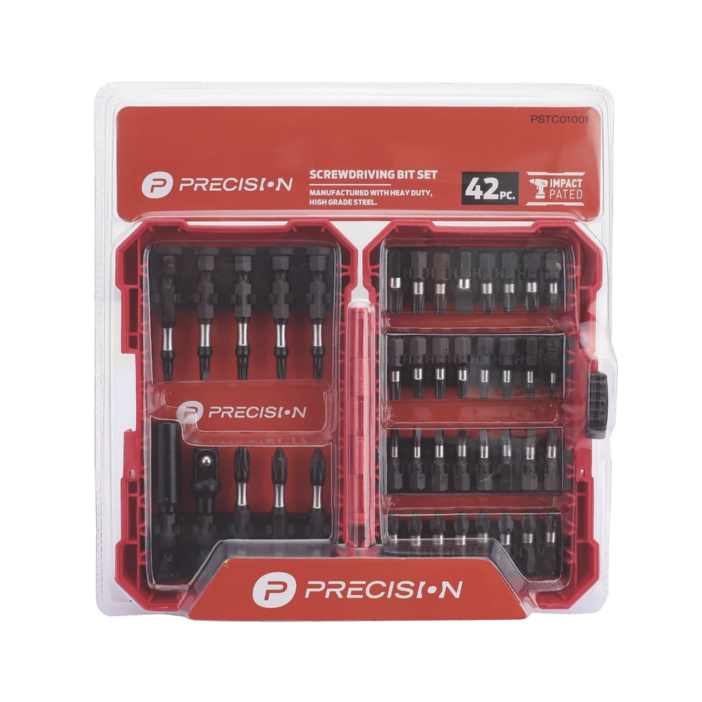 Este juego de 42 puntas es ideal para trabajos de atornillado y perforación, compatible con atornilladores y taladros de entrada hexagonal de ¼”. Fabricado en acero S2, reconocido por su alta dureza, resistencia a la abrasión y durabilidad.