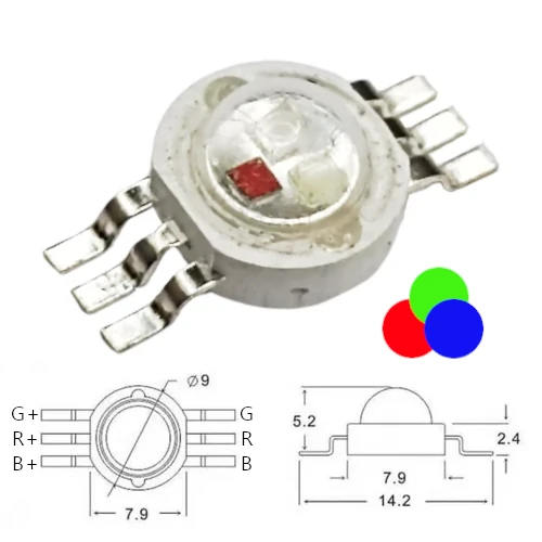 El LED SMD RGB 3W es un diodo emisor de luz de alta potencia que combina los colores rojo, verde y azul en un solo encapsulado. Gracias a sus 6 pines, permite controlar individualmente cada canal de color, logrando una amplia gama cromática mediante técnicas de modulación como PWM (modulación por ancho de pulso).