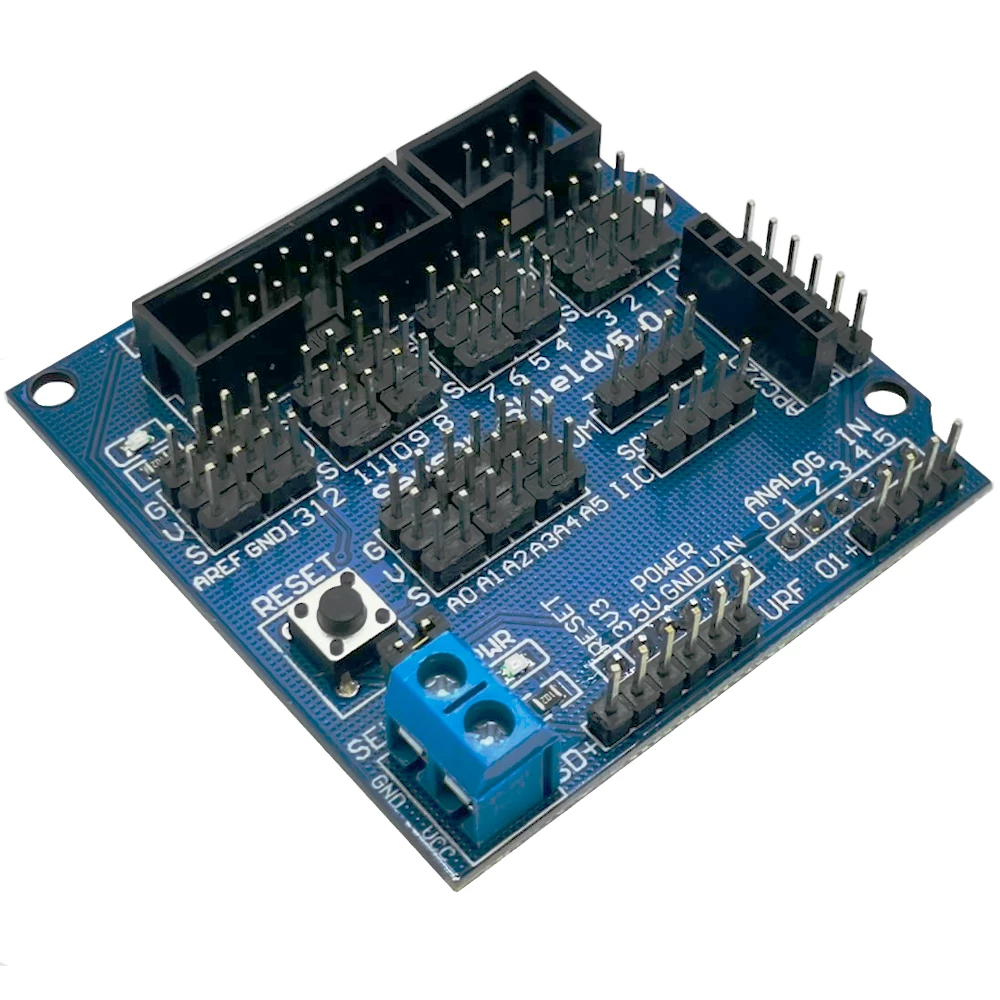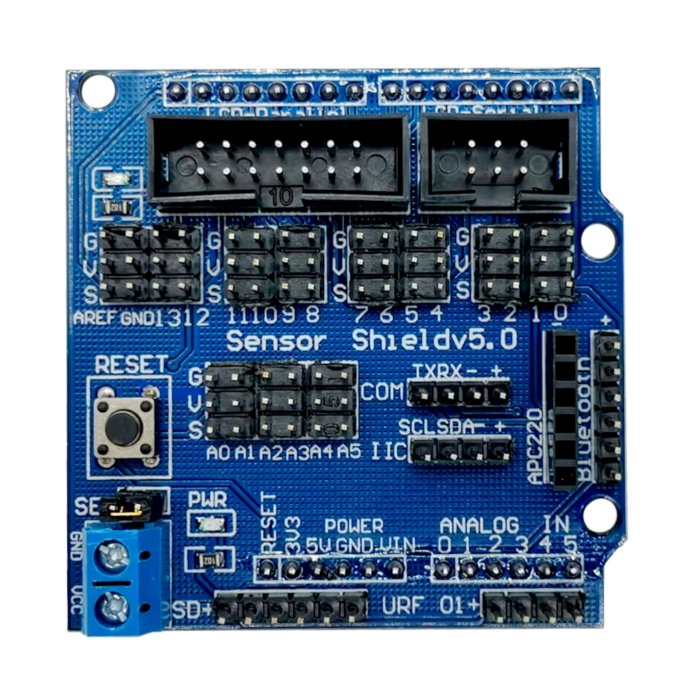 El Módulo de Expansión Sensor Shield v5.0 es una herramienta diseñada para simplificar y ampliar las capacidades de las placas Arduino, como el Arduino UNO R3. Este módulo permite la conexión fácil y directa de sensores, servomotores y otros dispositivos periféricos, reduciendo la complejidad del cableado y proporcionando múltiples interfaces estándar.