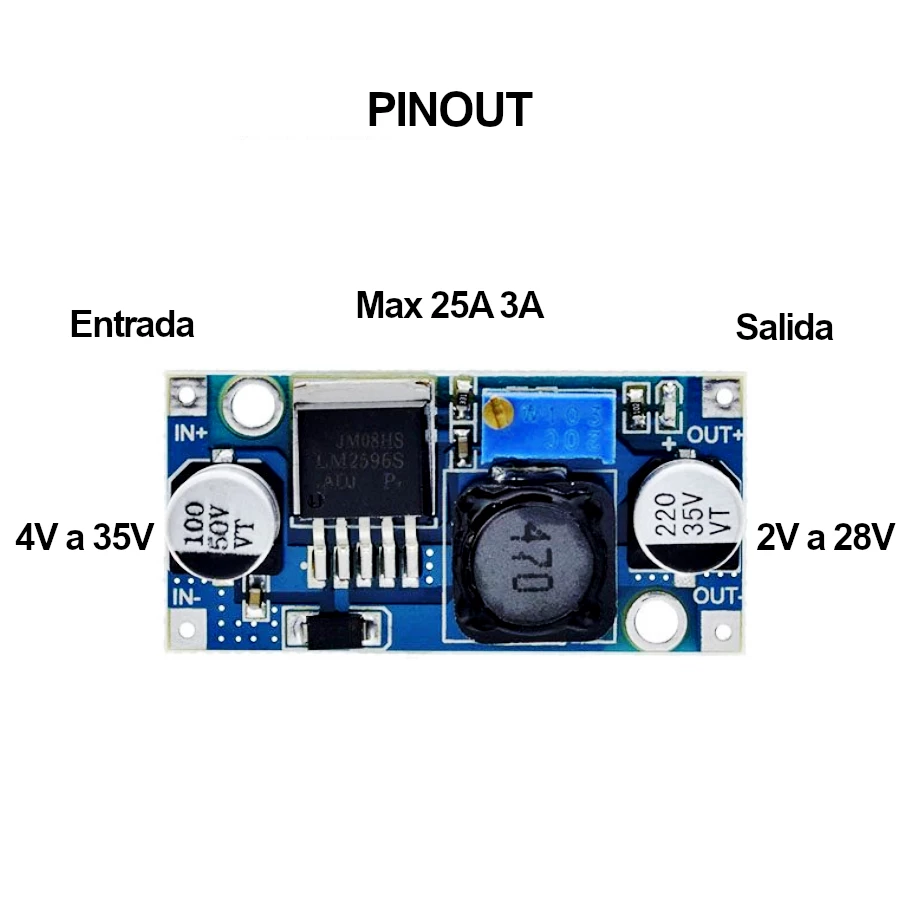 - Corriente de salida: Máx. 3 A (2.5 A recomendado; usar disipador para corrientes mayores a 2 A)