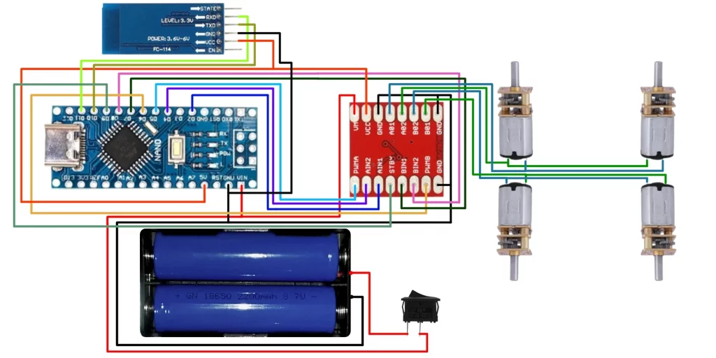 En este proyecto construiremos un robot controlado por Bluetooth utilizando un Arduino Nano V3, el driver TB6612FNG para controlar los motores, y el módulo Bluetooth HC-05 para recibir comandos inalámbricos desde un smartphone con la aplicación Serial Bluetooth Terminal