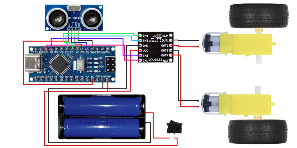 Este proyecto muestra cómo construir un robot evasor de obstáculos usando un sensor ultrasónico HC‑SR04, un driver de motores DRV8833 y una placa Arduino. El comportamiento del robot es sencillo y robusto: avanza en micro‑bursts, detecta obstáculos, retrocede, gira (alternando derecha/izquierda) y continúa.